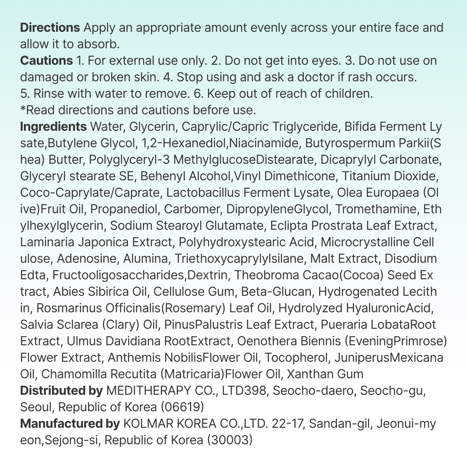 [FULL INGREDIENTS]Water, Glycerin, Caprylic/Capric Triglyceride, Bifida Ferment Lysate, Butylene Glycol, 1,2-Hexanediol, Niacinamide, Butyrospermum Parkii (Shea) Butter, Polyglyceryl-3 Methylglucose Distearate, Dicaprylyl Carbonate, Glyceryl Stearate SE, Behenyl Alcohol, Vinyl Dimethicone, Titanium Dioxide, Coco-Caprylate/Caprate, Lactobacillus Ferment Lysate, Olea Europaea (Olive) Fruit Oil, Propanediol, Carbomer, Dipropylene Glycol, Tromethamine, Ethylhexylglycerin, Sodium Stearoyl Glutamate, Eclipta Prostrata Leaf Extract, Laminaria Japonica Extract, Polyhydroxystearic Acid, Microcrystalline Cellulose, Adenosine, Alumina, Triethoxycaprylylsilane, Malt Extract, Disodium EDTA, Fructooligosaccharides, Dextrin, Theobroma Cacao (Cocoa) Seed Extract, Abies Sibirica Oil, Cellulose Gum, Beta-Glucan, Hydrogenated Lecithin, Rosmarinus Officinalis (Rosemary) Leaf Oil, Hydrolyzed Hyaluronic Acid, Salvia Sclarea (Clary) Oil, Pinus Palustris Leaf Extract, Pueraria Lobata Root Extract, Ulmus Davidiana Root Extract, Oenothera Biennis (Evening Primrose) Flower Extract, Anthemis Nobilis Flower Oil, Tocopherol, Juniperus Mexicana Oil, Chamomilla Recutita (Matricaria) Flower Oil, Xanthan Gum